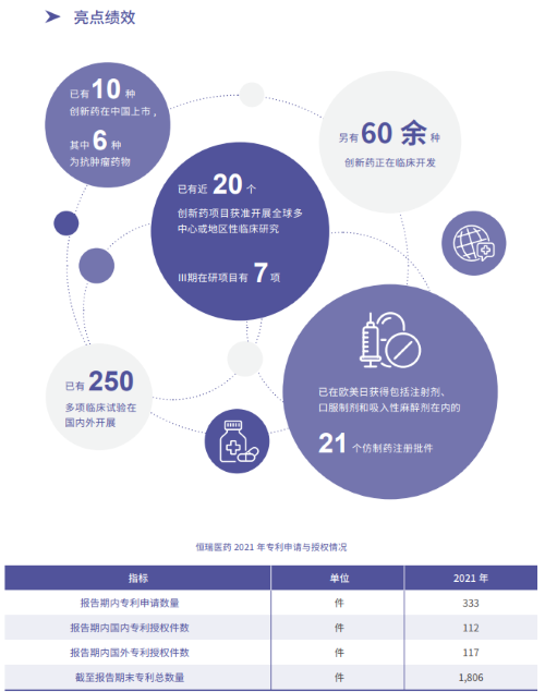 报告指出,在科技创新战略引领下,凯发娱乐医药2021年累计研发投入62.03亿元,比上年增长24.34%,研发投入占销售收入比重达到23.95%,再创历史新高。以此为支撑,2021年公司有3款创新药获批上市,已上市创新药总量增至10款,其中6款为抗肿瘤药物。同时还有60余种创新药正在临床开发,250多项临床试验在国内外开展,其中近20个创新药项目获准开展全球多中心或地区性临床研究。在创新药研发上,凯发娱乐医药已基本形成了上市一批、临床一批、开发一批的良性循环。