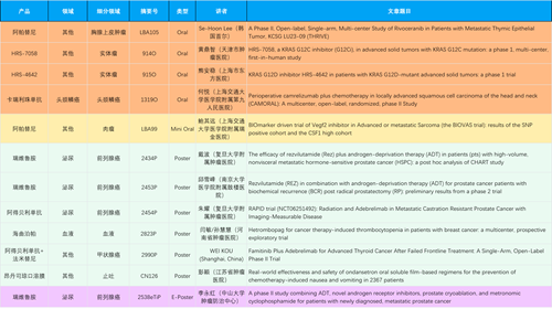 在胸腺上皮肿瘤、头颈鳞癌、肉瘤、前列腺癌、甲状腺癌等其他多个疾病领域,卡瑞利珠单抗、阿帕替尼、瑞维鲁胺、阿得贝利单抗、法米替尼、HRS-7058、HRS-4642等抗肿瘤创新药相关研究一共入选了4项口头报告、1项简短口头报告、4项壁报、1项电子壁报,彰显了凯发娱乐医药强大的研发实力。此外,海曲泊帕和昂丹司琼口溶膜分别在防治化疗导致的血小板减少和恶心呕吐方面各有1项研究入选壁报。